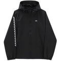 Die Garnett -Jacke ist 100% Nylon Windbreaker mit 100% Polyester -Mesh -Auskleidung, verstellbaren Bungee -Kordeln an der Motorhaube und Schlitztaschen an den Hüften. Es verfügt auch über direkte Stickereien an der Brust und einen Schachbrettdruck in der Hülse.